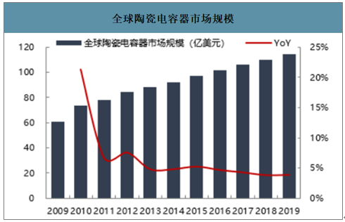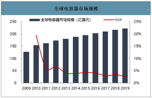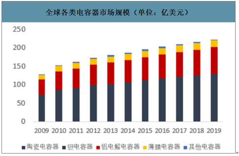 全球電容器市場空間預(yù)計超220億美元,年均復(fù)合增長率超5%。被動元件作為電子電路中的基礎(chǔ)構(gòu)成,受益于全球信息化產(chǎn)業(yè)的發(fā)展以及電子產(chǎn)品的快速進步,在電子產(chǎn)品中被動元件單機使用量大大增加,市場規(guī)模龐大。電容器作為最主要的被動元件,在被動元件市場占據(jù)約三分之二的份額,受行業(yè)整體帶動,規(guī)模不斷增長。2019年全球電容器市場規(guī)模達222億美元,2009-2019年均復(fù)合增長率達5.65%。