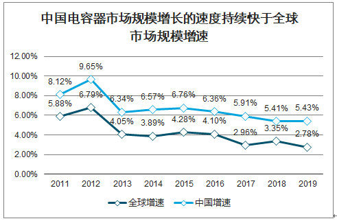 中國電容器市場規(guī)模增長的速度持續(xù)快于全球市場規(guī)模增速