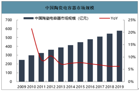 智研咨詢發(fā)布的《2020-2026年中國電容器行業(yè)市場運行潛力及投資趨勢預(yù)測報告》數(shù)據(jù)顯示:2019年全球陶瓷電容器市場規(guī)模將達到114.2億美元,中國為577.6億元。中國陶瓷電容器的市場規(guī)模占比將超過70%,為全球最大的電容器市場。而在全球陶瓷電容器領(lǐng)域中,片式MLCC占總規(guī)模的93%,引線式MLCC占3%,SLCC占4%。片式MLCC的應(yīng)用最廣,引線式MLCC因為尺寸和高度受限,無法滿足進一步小型化的要求,被片式MLCC逐步取代。