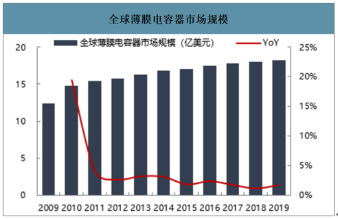 全球薄膜電容市場整體規(guī)模近年來保持平局每年1%左右的低速增長,2019年達到18億美元,約占整個電容器市場的8%;中國薄膜電容器市場規(guī)模增速高于全球市場,2019年達到87億人民幣,是全球最大的市場,占全球市場規(guī)模的60%以上。