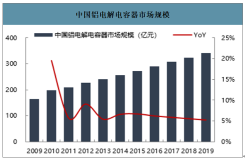全球鋁電解電容市場整體規(guī)模近年來保持每年4%左右的增長,2019年達到72億美元,約占整個電容器市場的32%;中國鋁電解電容器市場規(guī)模增速與全球市場持平,2019年達到341億人民幣,占全球市場規(guī)模的65%以上。