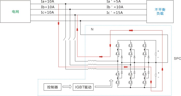 SPC開啟后,通過外接電流互感器(CT)實(shí)時(shí)檢測系統(tǒng)電流,并將系統(tǒng)電流信息發(fā)送給內(nèi)部控制器進(jìn)行處理分析,以判斷系統(tǒng)是否處于不平衡狀態(tài),同時(shí)計(jì)算出達(dá)到平衡狀態(tài)時(shí)各相所需轉(zhuǎn)換的電流值,然后將信號發(fā)送給內(nèi)部IGBT并驅(qū)動(dòng)其動(dòng)作,將不平衡電流從電流大的相轉(zhuǎn)移到電流小的相,最后達(dá)到三相平衡狀態(tài)。
