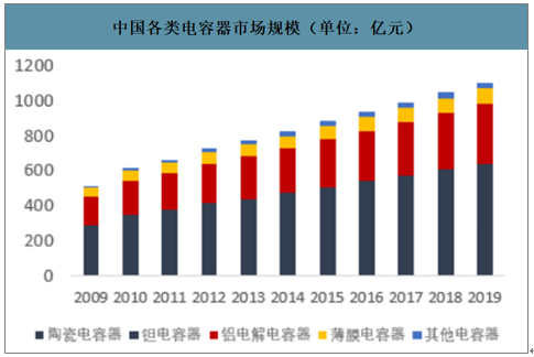 全球電容器市場空間預(yù)計超220億美元,年均復(fù)合增長率超5%。被動元件作為電子電路中的基礎(chǔ)構(gòu)成,受益于全球信息化產(chǎn)業(yè)的發(fā)展以及電子產(chǎn)品的快速進步,在電子產(chǎn)品中被動元件單機使用量大大增加,市場規(guī)模龐大。電容器作為最主要的被動元件,在被動元件市場占據(jù)約三分之二的份額,受行業(yè)整體帶動,規(guī)模不斷增長。2019年全球電容器市場規(guī)模達222億美元,2009-2019年均復(fù)合增長率達5.65%。