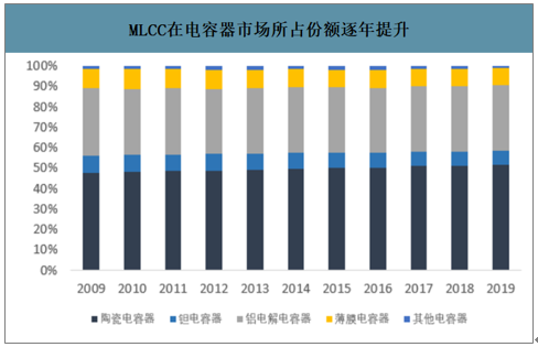 全球陶瓷電容器市場規(guī)模占電容器總體市場規(guī)模的比重從2009年的47%不斷上升至2019年的52%,市場規(guī)模達到114億美元,而鉭電容占比從9%下滑至7%,薄膜電容從10%下滑至8%。由于電容器下游的各類電子產(chǎn)品在一定程度上均有小型化趨勢(如消費電子智能化、輕薄化;軍事裝備輕型化、高性能化;汽車電子集成化等),需要越來越多微型的電容器。而MLCC相較于薄膜電容器和鋁電解電容器更易于小型化,且相比鉭電容具有成本優(yōu)勢。同時經(jīng)過MLCC廠家多年的研發(fā),出現(xiàn)了大量專為特定場景設(shè)計的MLCC產(chǎn)品,擴充了MLCC的應(yīng)用場景。這些MLCC的電容量不斷增加,工作溫度范圍進一步拓展(能在150℃以上環(huán)境中穩(wěn)定工作),且耐壓性和頻率特性得到升級。綜合來看,在小型化與應(yīng)用場景豐富化的大背景下,MLCC有望占據(jù)更多市場份額。