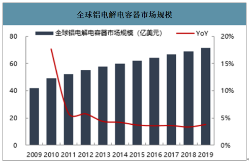 全球鋁電解電容市場整體規(guī)模近年來保持每年4%左右的增長,2019年達到72億美元,約占整個電容器市場的32%;中國鋁電解電容器市場規(guī)模增速與全球市場持平,2019年達到341億人民幣,占全球市場規(guī)模的65%以上。
