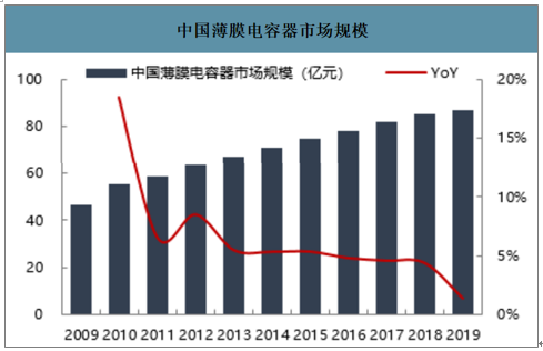 全球薄膜電容市場整體規(guī)模近年來保持平局每年1%左右的低速增長,2019年達到18億美元,約占整個電容器市場的8%;中國薄膜電容器市場規(guī)模增速高于全球市場,2019年達到87億人民幣,是全球最大的市場,占全球市場規(guī)模的60%以上。