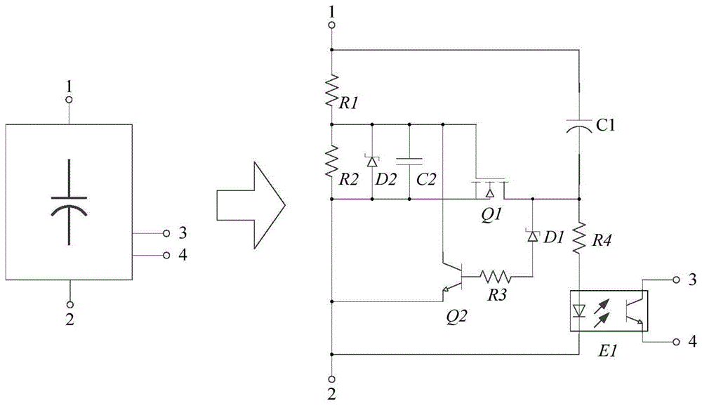3.根據(jù)權(quán)利要求1所述的智能電容器,其特征在于:所述電容c1為500v/120uf、電阻r4=10kω、電阻r1=200kω、r2=43kω、r3=100kω,c2=10uf、穩(wěn)壓管d1擊穿電壓20v、穩(wěn)壓管d2擊穿電壓12v及場(chǎng)效應(yīng)管q1耐壓500v,導(dǎo)通阻抗50mω。
