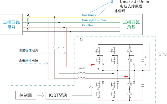 SPC開啟后通過外部電流互感器(CT),實(shí)時(shí)檢測負(fù)載電流,并通過內(nèi)部控制器計(jì)算來分析負(fù)載電流的無功含量,然后根據(jù)設(shè)置值來控制PWM信號發(fā)生器發(fā)出控制信號給內(nèi)部IGBT使逆變器產(chǎn)生滿足要求的無功補(bǔ)償電流,最終實(shí)現(xiàn)動(dòng)態(tài)無功補(bǔ)償?shù)哪康摹?/span>