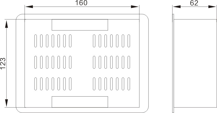 在屏柜上開(kāi)長(zhǎng)164*高125mm的長(zhǎng)方孔,將本產(chǎn)品從屏前推入長(zhǎng)方孔內(nèi),把配給的緊固件插入安裝槽中,上緊插件即可固定在屏上??刂苾x外形尺寸圖如下: