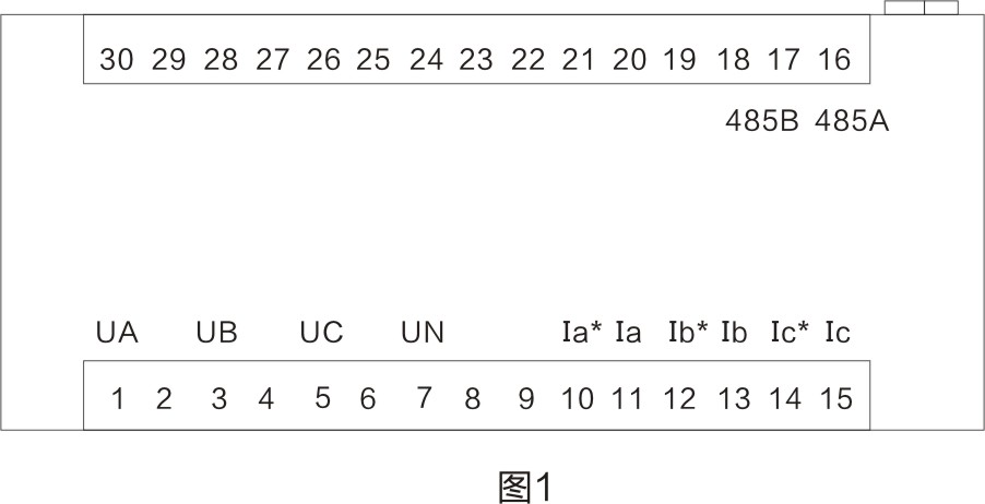 控制儀接線端子排列如下圖1所示。圖中,UA、UB、UC、UN為A、B、C、N三相四線AC 380V電源接口;Ia*、Ia、Ib*、Ib、Ic*、Ic為網(wǎng)側(cè)一次CT取樣電流接口;485A、485B為SVG設(shè)備通訊聯(lián)機(jī)接口;數(shù)據(jù)線接口為網(wǎng)側(cè)二次CT取樣電流接口和智能電容器通訊聯(lián)機(jī)接口。