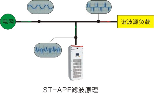 ST-APF通過外部互感器CT實(shí)時(shí)采集電流信號,通過內(nèi)部檢測電路分離出其中的諧波部分,通過IGBT功率變換器產(chǎn)生與系統(tǒng)的諧波大小相等相位相反的補(bǔ)償電流注入電網(wǎng),實(shí)現(xiàn)濾除諧波的功能。